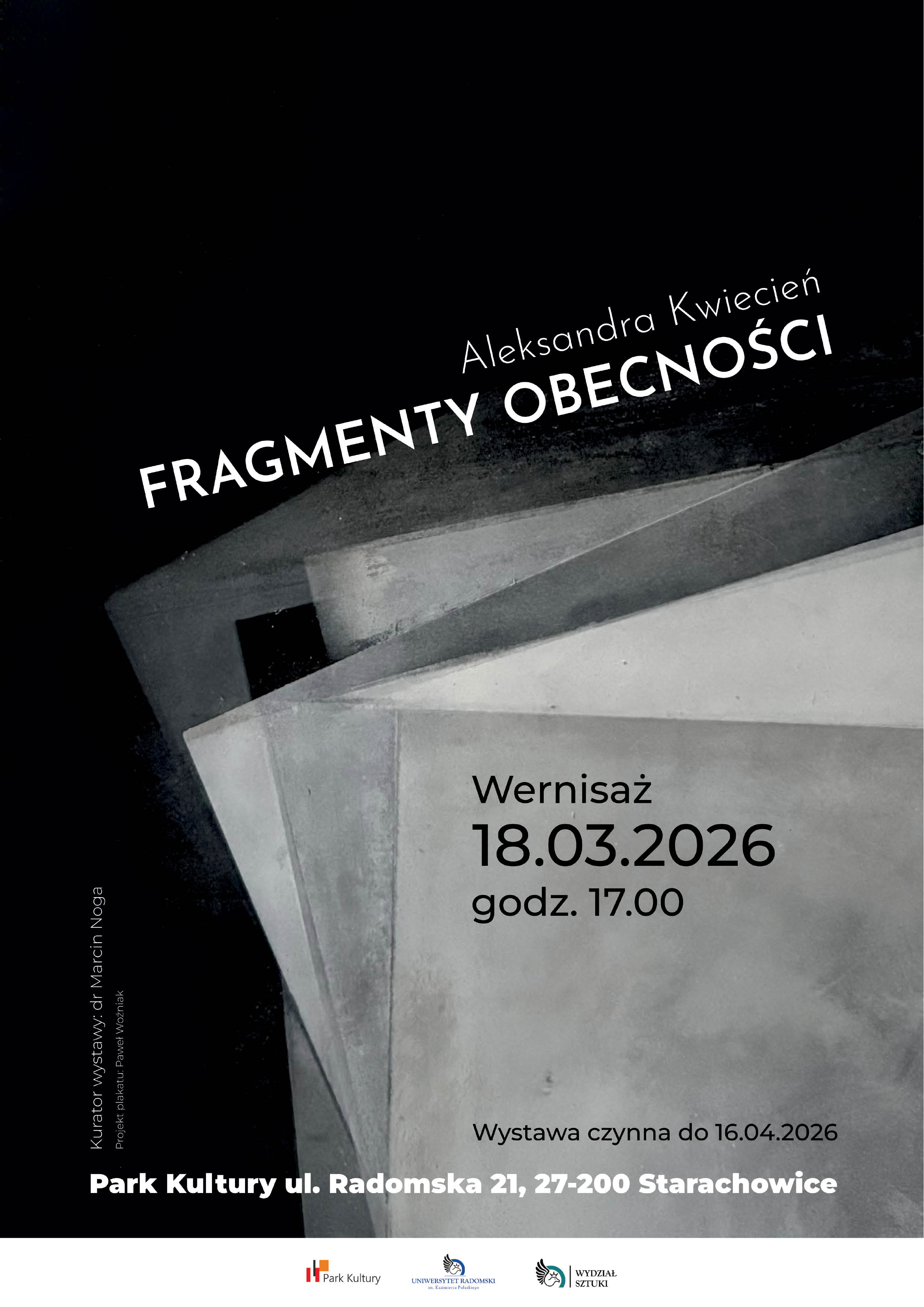 Park Kultury, Uniwersytet Radomski im. Kazimierza Pułaskiego, Wydział Sztuki UR zapraszają na wernisaż wystawy FRAGMENTY OBECNOŚCI autorstwa Aleksandry Kwiecień.